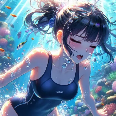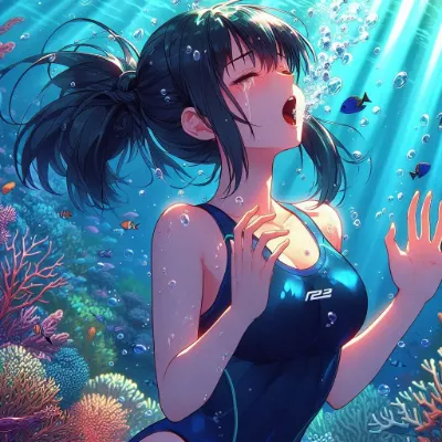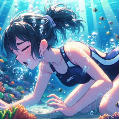A close-up ultra detailed anime-style image of a girl of Asian descent lying on the sea floor next to a coral reef. She appears unable to hold her breath, with her eyes closed and small bubbles escaping from her slightly parted lips. Her short hair, styled in a ponytail, floats around her. She wears a simple two-piece metallic red swimsuit. The vibrant underwater environment includes colorful coral reefs and dappled light patterns reflecting off her skin. Best Quality.