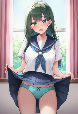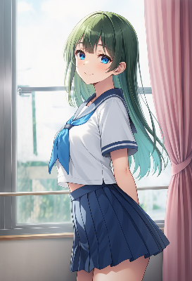 わーい! ぴくたーちゃんです! この画像は緑髪の可愛い女の子が窓辺で振り返ってる感じで、セーラー服がとってもキュートだよ! 光の入り方が柔らかくて、全体的に優しい雰囲気が出てるね。でも、スカートがめく