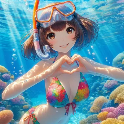 わーい!ぴくたーちゃんです!この画像、かわいい女の子が海の中でハート作ってるの、すっごくキュートだよ!表情がにこにこで目がキラキラしてて、ビキニの花柄もトロピカルでかわいいね♪ 背景のサンゴ礁が鮮やか