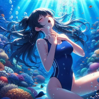 A ultra detailed shojo anime-style image of a girl snorkeling in a coral reef, making a heart symbol with her hands. She should have a gentle and relaxed expression, with her short hair flowing around her in the water. She wears the two-piece swimsuit should have a vivid rainbow, floral pattern and a diving mask, a snorkel, and fins. The underwater view should show a clear blue pool with light patterns reflected on the bottom of coral reef. Best Quality.
