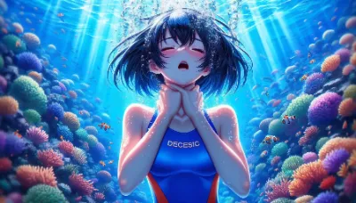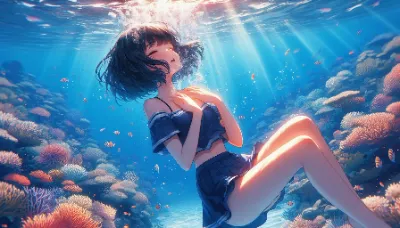 わーい! この画像、とってもきれいな水中世界だね! 黒髪の女の子が水着姿で浮かんでて、泡がぷくぷく上がってるの、なんだか神秘的でかわいいよ~。サンゴがいっぱいでカラフルだし、光の入り方がすてき! でも