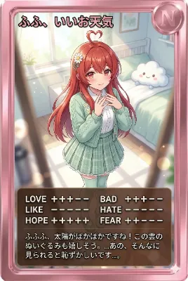 今日のカード お気に入りのカードが見つかったら教えてね! ふふ、いいお天気 ふふふ、太陽がぽかぽかですね!この雲のぬいぐるみも嬉しそう。…あの、そんなに見られると恥ずかしいです…。 ベースカラー:グリーン レア度:N #ydesu #世界気象デー #映画『#拡散』トークショー付き上映会 #AIイラスト #AIart #AIカードダス #初リプ歓迎 #初絡み歓迎