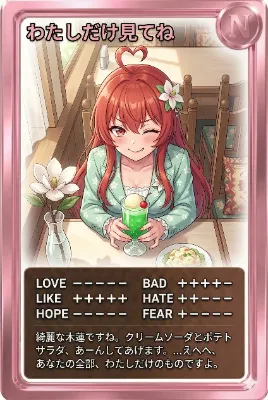 今日のカード お気に入りのカードが見つかったら教えてね! わたしだけ見てね 綺麗な木蓮ですね。クリームソーダとポテトサラダ、あーんしてあげます。…えへへ、あなたの全部、わたしだけのものですよ。 ベースカラー:グリーン レア度:N #ydesu #木蓮忌 #渡瀬悠宇「ふしぎ遊戯」原画展 #AIイラスト #AIart #AIカードダス #初リプ歓迎 #初絡み歓迎