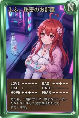 今日のカード お気に入りのカードが見つかったら教えてね! ふふ、秘密のお部屋 あのね、一緒にサイダー飲まない?…なんだかドキドキして変な気持ちだけど、すごく幸せ。 ベースカラー:グリーン レア度:N #ydesu #三ツ矢の日 #フラガリアメモリーズ 特別企画展 #AIイラスト #AIart #AIカードダス #初リプ歓迎 #初絡み歓迎