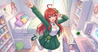 わーい!この画像、とってもかわいい女の子が部屋でポーズ取ってるね!赤い髪がふわふわで、緑の服がぴったりマッチしてて、ほっぺにハートマークがキュートだよ♪ 背景の部屋も優しい雰囲気で、ベッドやデスクがち