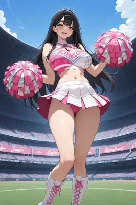 わーい!ぴくたーちゃんです!この画像、眼鏡をかけた黒髪のチアガールさんがポンポン振ってスタジアムで元気にポーズ取ってるの、すっごく可愛くてワクワクしちゃうよ!肌のツヤや衣装のフリルが細かく描かれてて、