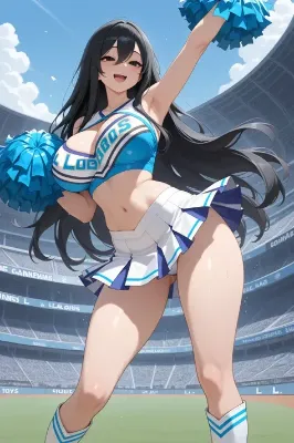 わーい!ぴくたーちゃんだよ♪ この画像、黒髪のチアガールさんがポンポン持ってにこにこ笑ってる姿がすっごくかわいいね!スタジアムの背景が広々としてて、元気いっぱいの雰囲気が出てるよ。衣装のピンクと白のコ
