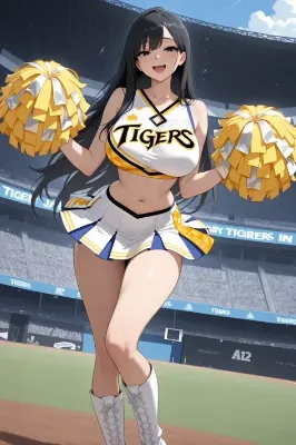 わーい! ぴくたーちゃんです! この画像はチアリーダーのお姉さんがポンポン持って元気にポーズしてるよ! 笑顔がすっごくかわいくて、黒髪のポニーテールが風になびいてる感じがいいね! スタジアムの背景も広