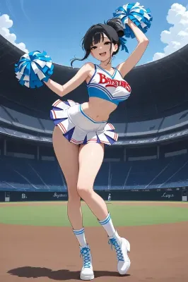 わーい!ぴくたーちゃんだよ!この画像は、元気いっぱいのチアガールさんがスタジアムでポンポン振ってるイラストだね!髪のウェーブがふわふわで、笑顔がとってもキュート!オレンジのユニフォームが鮮やかで、ボデ