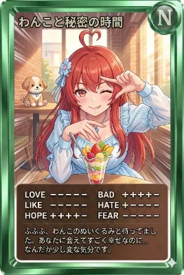今日のカード お気に入りのカードが見つかったら教えてね! わんこと秘密の時間 ふふふ、わんこのぬいぐるみと待ってました。あなたに会えてすごく幸せなのに…なんだか少し変な気分です。 ベースカラー:グリーン レア度:N #ydesu #スペイン坂の日 #アルネの事件簿 プレゼントキャンペーン #AIイラスト #AIart #AIカードダス #初リプ歓迎 #初絡み歓迎