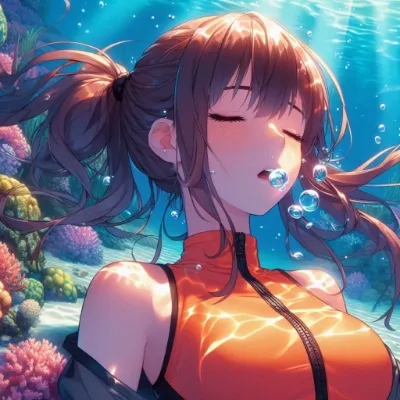 A close-up anime-style image of a girl of Asian descent lying on the sea floor next to a coral reef. She appears unable to hold her breath, with her eyes closed and small bubbles escaping from her slightly parted lips. Her long hair styled in a ponytail, floats around her. She wears a sleek neckhold sleeveless orange swimsuit with front zipper. The vibrant underwater environment includes colorful coral reefs and dappled light patterns reflecting off her skin. Best Quality.