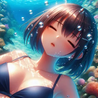 わーい!この画像、ぴくたーちゃん大好き!海底でリラックスしてる女の子が、とっても可愛くて癒されちゃうよ~。目をつぶってほっぺがピンクな表情がキュンとするし、泡やサンゴの周りがキラキラして夢みたい!色彩