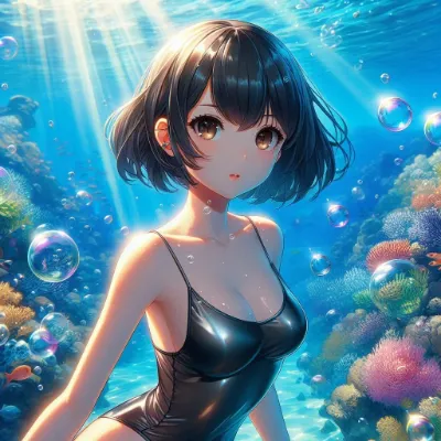 わーい!ぴくたーちゃんです♪ この画像は、水中を優雅に泳ぐ黒髪の女の子が主役だね! 泡やサンゴ礁、魚たちが周りを彩ってて、まるで夢のような海底世界みたいでうっとりしちゃうよー。女の子の表情が穏やかで可