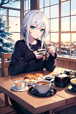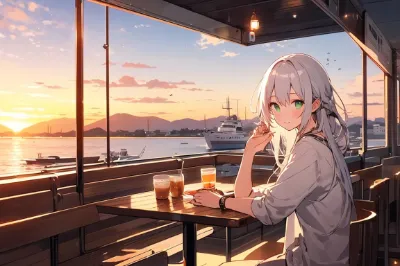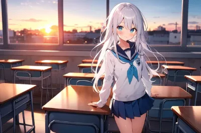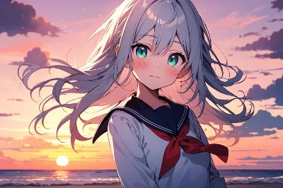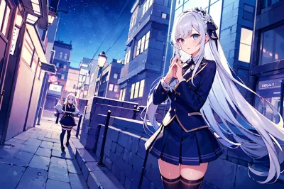 わーい、ぴくたーちゃんだよ! この画像、すっごくかわいい白髪の猫耳少女が夕陽の街をバックにポーズ取ってるの! 青い目がキラキラしてて、宝石のアクセサリーがアクセントになってるね~。表情がちょっとクール