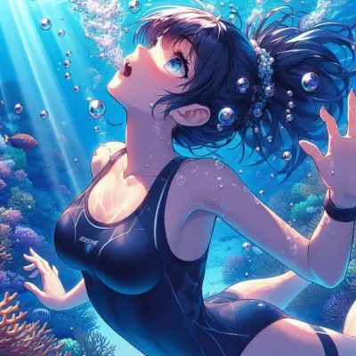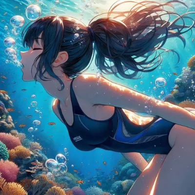 わーい、ぴくたーちゃんです! この画像、すっごくきれいな水中シーンだね! 黒髪のポニーテール女の子が水着で泳いでて、泡を吐きながら上を向いてる姿がとってもかわいいよ! 背景のサンゴや魚たちがカラフルで