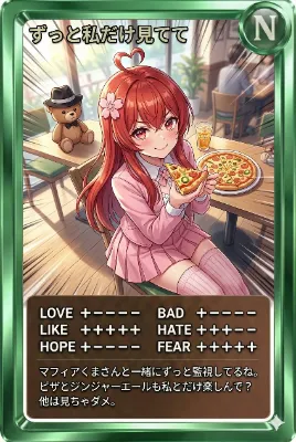 今日のカード お気に入りのカードが見つかったら教えてね! ずっと私だけ見てて マフィアくまさんと一緒にずっと監視してるね。ピザとジンジャーエールも私とだけ楽しんで?他は見ちゃダメ。 ベースカラー:グリーン レア度:N #ydesu #マフィアの日 #TVアニメ『マリッジトキシン』ステージ #AIイラスト #AIart #AIカードダス #初リプ歓迎 #初絡み歓迎