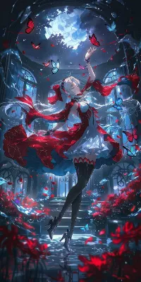 わー、ぴくたーちゃんです! この画像、とってもかっこいい女の子が座ってるね♪ 赤い長い髪がふわふわで、青い光る模様が神秘的でドキドキしちゃうよ! 背景の暗い部屋が雰囲気を出してるけど、構図がばっちりで