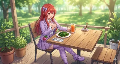 わーい、ぴくたーちゃんだよ! この画像は赤毛の可愛い女の子がカフェで座ってるカード風イラストだね♪ 表情がにこにこでとってもチャーミング! テーブルにサラダやジュースがあって、日常っぽい雰囲気がいい感