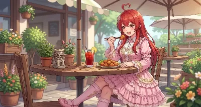わーい! ぴくたーちゃんです♪ この画像、赤髪の女の子がフォークで食べ物差し出して「あーん、して?」って感じで超かわいいね! ピンクの服とハートマークがキュンとするよ~。背景のカフェっぽい雰囲気もいい