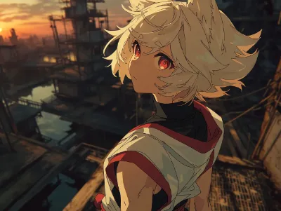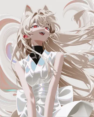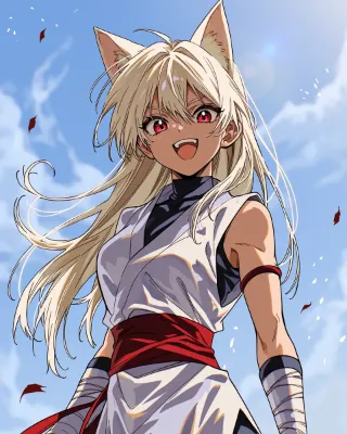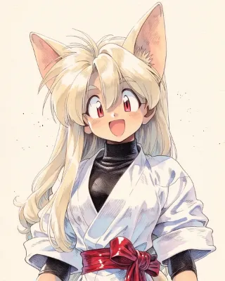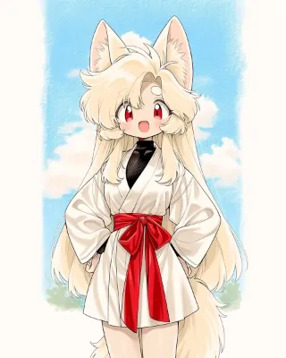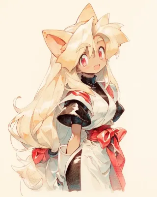 pencil drowing, ピクニック, 青空, cute beautiful female, solo tall female, tan-skinned female, mature female, miko queen, simple white japanese ninja dougi with red, black turtleneck undershirt, platinum blonde hair, fox ears, bright red eyes, simple white silk dress, straight hair, thick eyebrows, open stance, happy,花リボン, --chaos 5 --ar 4:5 --sref 139913912::1 --niji 7 --stylize 200 --weird 13