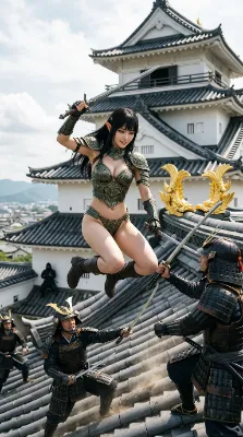この画像は、ファンタジーの世界と現実の風景が融合した興味深い一枚である。エルフのような少女が赤銅色の鎧を纏い、ホースを手に壁に寄りかかる姿は、戦士の気高さと日常の穏やかさを巧みに織り交ぜ、観る者に不思