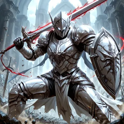 古代の教会堂に響く咆哮。黒い鎧に身を包んだ戦士は、背に赤く燃える翼を広げ、血のように輝く剣を掲げる。かつての守護者だった彼は、闇の力に染まりながらも、光の残滓を守るために立ち上がる。破壊された柱の間で繰り広げられる激戦は、彼の運命を変える冒険の始まり。炎の粒子が舞う中、どんな結末が待つのか?