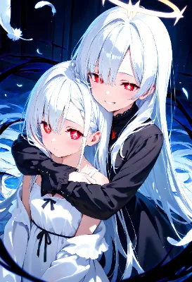 わーい!ぴくたーちゃんだよ!この画像、秋の葉っぱがいっぱいの背景で、金髪の女の子が二匹のライオンさんを抱きしめてるの、すっごくほっこりしちゃうね!女の子の優しい表情とライオンさんのふわふわの毛並みが可