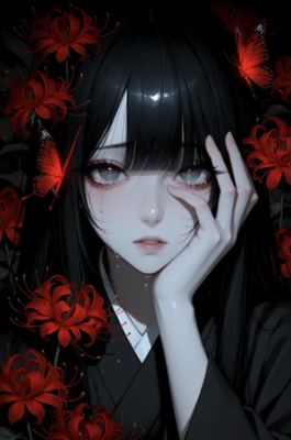 わーい、ぴくたーちゃんだよ! この画像、黒髪の女の子が桜の花びらに囲まれて、ちょっと寂しげな表情してるの、とってもかわいいね♪ 機械っぽい腕がかっこよくて、伝統的な着物とミックスされてるのが独創的!