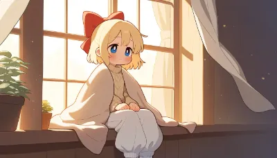わーい!ぴくたーちゃんだよー!この画像、ふたりの女の子がお茶してるシーンで、すっごくほっこりしちゃうね!左の黒髪の子の優しい表情と、右の金髪リボンちゃんの元気な感じが可愛くてたまらないよー!背景のカフ