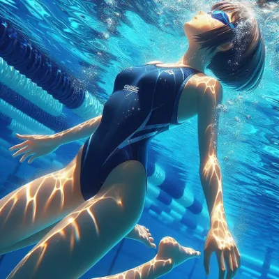 わーい!ぴくたーちゃんだよ♪ この画像、すっごくきれいな水中世界で、ポニーテールの女の子がビキニで泳いでる姿がとってもキュート! カラフルなサンゴ礁と魚さんたちが周りを囲んでて、まるで夢みたいな風景だ