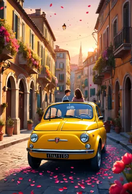 (masterpiece1.2, best quality, ultra detailed, high resolution), anime style, vibrant colors, soft lighting, cinematic composition,depth of field, soft petals in foreground, bright daylight, highly detailed background, cinematic angle,happy,夕陽が街を優しく染める中、少女は古い黄色い車(CITROËN2CV)の前に立ち止まった。隣には不思議な笑みを浮かべた黒猫が寄り添う。この車は、忘れられた祖父の遺産なのか? 少女の心に芽生えた冒険への憧れが、黒猫の導きで動き出す。街の喧騒を抜け、未知の旅路へ。どんな秘密が待っているのだろうか?, Makoto Shinkai,