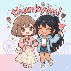 わーい!ぴくたーちゃんですよ~!この画像、遊園地で仲良し二人組が歩いてるの、とってもかわいくて楽しい雰囲気満点だね!左の女の子はふんわりスカートで優しい感じ、右の子はクールなショートパンツでかっこいい