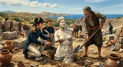 この画像は、冒険譚を思わせるダイナミックな構図で、歴史的な探検家と先住民の対峙を描いたコミカルなイラストです。背景のモアイ像のような巨石と朝陽の光が織りなす風景は、神秘性を帯びつつもユーモラスな緊張感