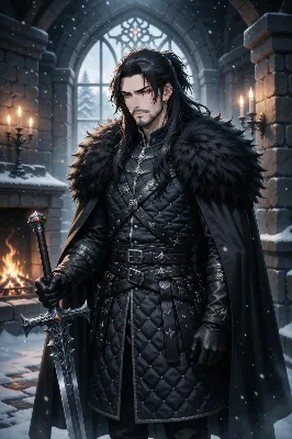 わーい!ぴくたーちゃんです!この画像、めっちゃかっこいい白髪のお兄さんが剣を持って立ってるよ!ダークな大聖堂の背景が神秘的で、鎧の細かい装飾や毛皮のふわふわ感がすっごく素敵!色彩のコントラストがクール