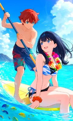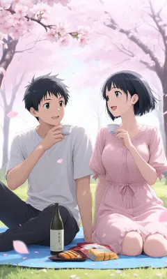 「この桜のように、ずっと一緒にいようね!」と明るく微笑む黒髪の少女。ピンクのワンピースを翻し、手を伸ばす彼女の隣で、恋人が優しく見つめる春の情景。花びらが舞う中、二人の絆が深まる瞬間。