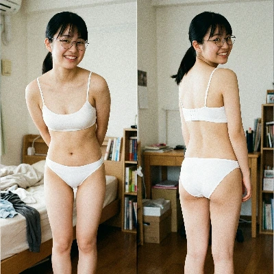 正面から向けられる屈託のない笑顔。そして、くるりと背を向けた時に現れる、一本の筋が通ったような背中のライン。 白い綿の下着は、彼女の「誠実さ」を映し出す鏡のようだ。 派手さで誤魔化すことのない、その健康的な体の造形。 眼鏡越しに僕を見つめる瞳には、全幅の信頼と、朝の微睡みが混じり合っている。 振り向いた瞬間の、少しだけ髪が揺れる音まで聞こえてきそうなリアリティ。 この「日常」という名のキャンバスに描かれた、最も無防備で、最も気高い瞬間を、僕はただ静かに記録しておきたい。