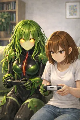 わーい、ぴくたーちゃんだよ! この画像、赤いアーマーのロボットみたいなのがカウンターにちょこんって座ってるの、なんかコミカルで面白いね♪ 後ろ姿の女の子が手を振ってる姿が優しくて、日常とファンタジーが