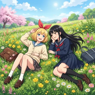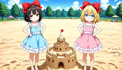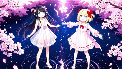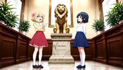 2girls,standing,excited expression,open mouth smile,sparkling eyes,arms raised in delight,jumping slightly,blond hair,short hair,bob hair,blue eyes,(hair bow:1.4),red bow,large bow,side blunt bangs,hair between eyes,small chest,young child,colorful summer festival dress,light pink yukata with floral pattern,wooden sandals,another girl with black hair,short hair,bob hair,dark brown eyes,(hair bow:1.3),yellow bow,small chest,young child,light blue yukata with star pattern,wooden sandals,both girls facing lion costume performer,hands reaching forward with excitement,feet lifted slightly off ground,toes pointing outward,outdoor Japanese summer festival background,festival stalls,paper lanterns,colorful banners,crowd of people,festive lighting,(lion costume:1.4),(festival:1.3),(excited children:1.2),(Japanese festival:1.2),(masterpiece:1.4),(best quality:1.3),(very aesthetic:1.2),(absurdres:1.3),