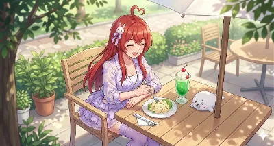 わーい! ぴくたーちゃんだよ♪ この画像、赤髪の女の子がアザラシみたいなかわいい生き物と一緒にテーブルにいるの、すっごくキュートだね! ポーズがドキドキしちゃう感じで、ピンクのフレームが全体をふんわり