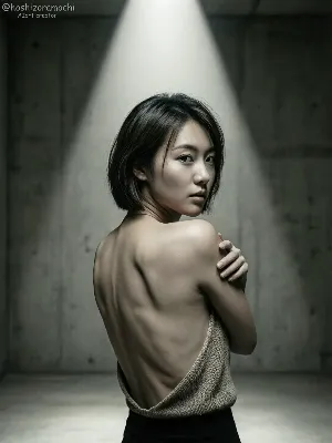 A motel room with slightly faded wallpaper reminiscent of an American road movie. Sitting on a worn bed, bathed in the strong morning backlight, is a young East Asian woman with a cute, idol-like face. Her slender figure. Her cleavage. She holds a half-empty mug in one hand and casually brushes back her messy blonde hair with the other. She is dressed casually in a thin tank top and denim shorts, and the soft flesh from her thighs to her knees and her outlines blown out in white by the backlight create an everyday feel within the extraordinary. The grain characteristic of film and the flare from the window envelop the entire frame, creating a snapshot that is both tense and intimate, as if one is spying on a secret rendezvous.