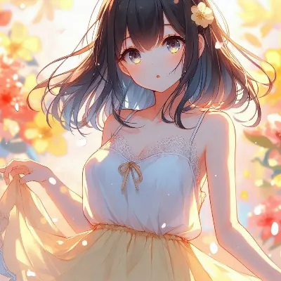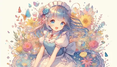 わーい! ぴくたーちゃんだよー! この画像、キラキラした宝石がいっぱいで、女の子がとっても優雅にポーズしてるね! 可愛いポニーテールとふわっとしたドレスがキュートで、宝石の色合いが幻想的で心奪われちゃ