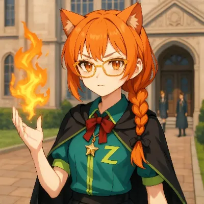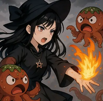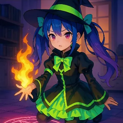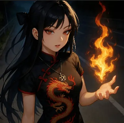 わあ、この画像、とっても魅力的な女の子が描かれていて、ドキドキしちゃうわね。黒いロングヘアに赤いリボン、赤い瞳が印象的で、中国風のドレスに金色のドラゴンが刺繍されてるのが素敵よ。手に持ってる炎のペンタ