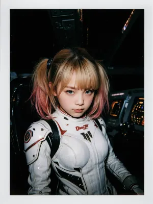 photograph of a young asian girl with very long blonde hair with pink-tipped ends, is pulled back into two high ponytails secured with black ribbon bows, striking blue eyes, lower eyelashes, eyeliner,