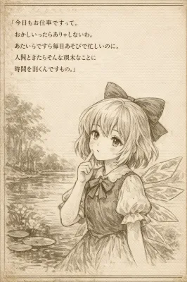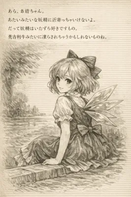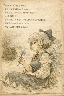 東方Projectの妖精(髪が長いふんわりとした薄紫色で、鮮やかな紫色のリボンをしており、透明な蝶のような形の羽をもち、黄色のワンピースを纏う)がその長刀と短刀を掲げて忍び足でもっていこうとしている。なお、長刀と短刀いずれも鞘に納められている。そしてこの妖精はニシシと笑いつつ、妖夢とは逆方向に立ち去っている。