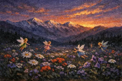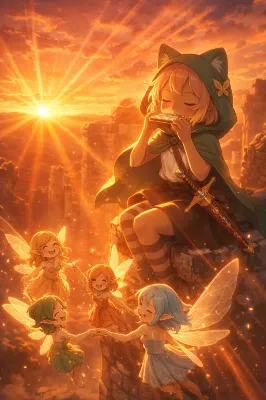 わーい!ぴくたーちゃんだよぉ!この画像、緑の服の女の子がのんびりお茶してる横で、紫髪の妖精ちゃんが刀持ってびっくりさせてるシーンだね!とってもかわいい表情とポーズが魅力的で、和室の背景もほっこりするよ