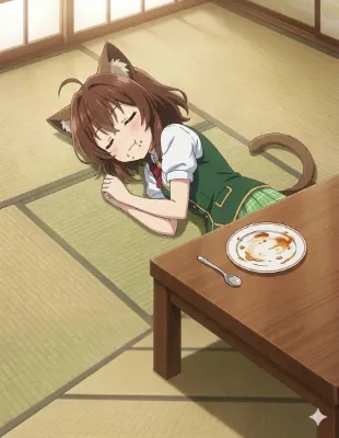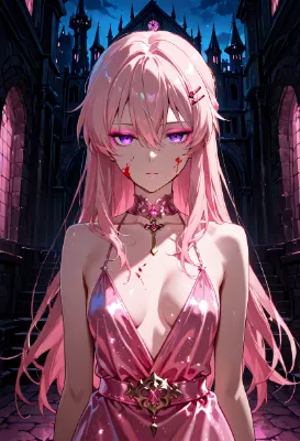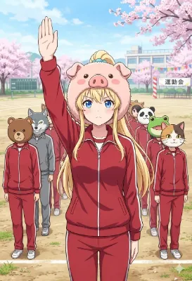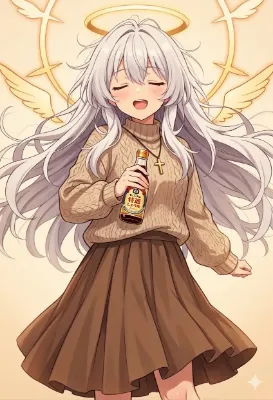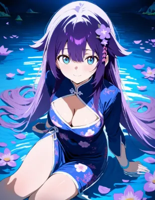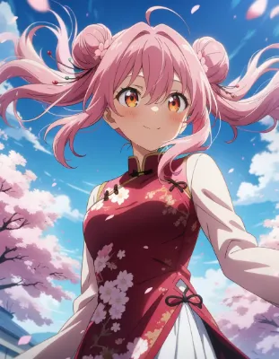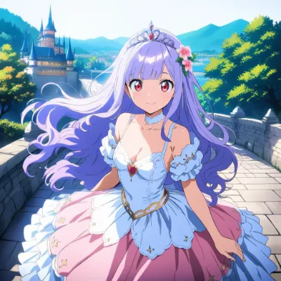 わーい!この画像、桜の花びらがふわふわ舞ってる中で、メイドさんの可愛い女の子がにこにこ笑ってるよ~!ぴくたーちゃん、すっごくキュンキュンしちゃう!可愛らしさはもう満点級で、青いドレスと紫の髪がぴったり