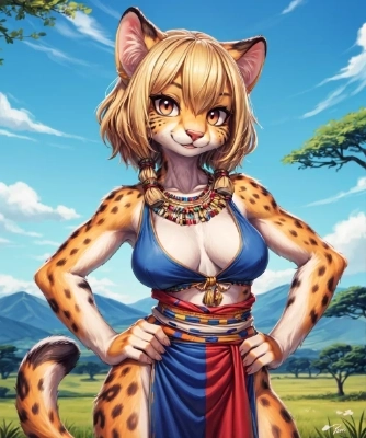 furry female, cheetah, felid, feline, mammal, anthro, athletic, blonde hair, clothing, female, fur, hair, solo, spots, spotted body, spotted fur
