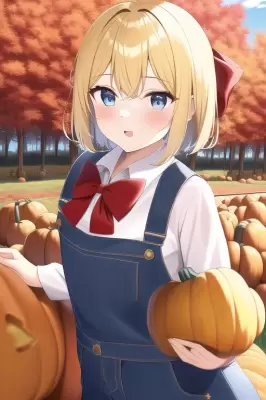 masterpiece,bestquality,1girl,loli,blondhair,shorthair,{{{{hairbow}}}},{{{{redbow}}}},blueeyes,overall,blouse,{{pumpkinpatch}},dynamicangle,autumn,