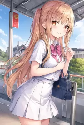 (((masterpiece))), (best quality), ((ultra-detailed)),(((1 girl))),loli,a cute girl,school uniform, holding a bag, (waiting train), (illustration), (detailed clothes), ((detailed face)),loli,small,little young female,kawaii,female students, holding detailed girls items,smile with open mouse,standing in que,///,sunny day,(railway platform, crowded),front view
