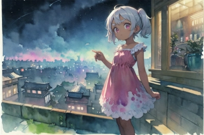 (dark skin:1.4), 9 years old, twintails, pigtails, short hair, silver hair, big eyes, round eyes, droopy eyes, pink eyes, tareme, thick eyebrows, long eyebrows, bushy eyebrows, cute, kawaii, child, kid, infant, illustration, pixiv, Kyoto Animation, manga, artist by Tetsuhiro KOSHITA, comic, game, thick outline, heavy outline, solo, dandy, (watercolor:1.4).night_view, serene_expression, standing_pose, flowy_dress, dark_blue, rooftop_terrace, over_the_shoulder